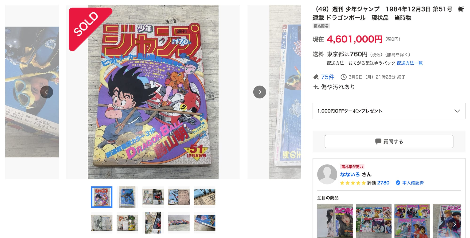The first copy ended on Saturday, March 7th with 400 bids and an ending price of ¥4,101,000. One could attribute this ending price to the overall condition of the magazine, but then the next sale which just ended about an hour ago as of writing would dispell that idea somewhat.