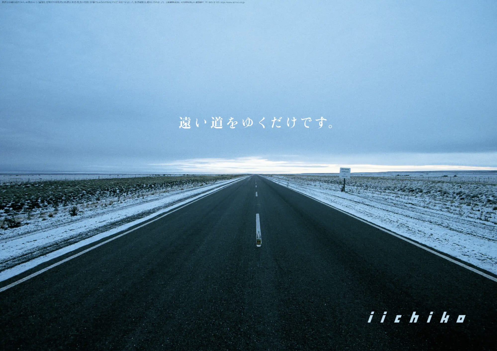 Two long rows of trees stretched far into the horizon, casting dark corridors of deep shadow onto the sandy ground. When I stepped closer, I saw that the grounds were empty, and the sky over-exposed. I could smell the trees. Not a person in sight. I noticed something and looked again. Sitting tiny in the frame’s expanse but unmistakable once noticed was a single glass bottle. At the moment I saw it, a yellow word-mark revealed itself from the trees: ‘iichiko’. To the right of frame was a short, cryptic phrase standing vertical among the trunks: その向こうにひらけるもの。“That which opens in the distance”, or maybe: ”What reveals itself from the beyond”