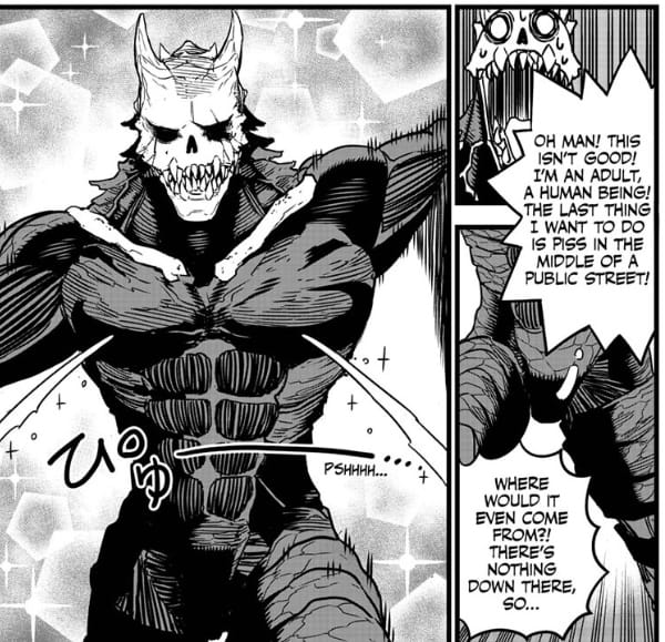 Returning to the narrative, chapter 1 of Kaiju No. 8 is incredibly bombastic, introducing us to both the main concept of the world (kaiju attacks) and the main conflict of our protagonist (mid-life crisis) at the same time. It also leaves off on an incredible cliffhanger, with Kafka transformed into a kaiju by a mysterious bug and seemingly robbed of his chance to join the Defense Force.