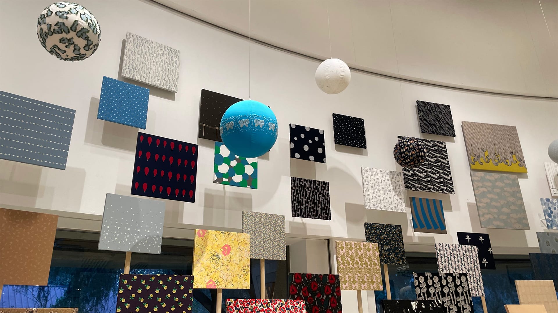 The exhibition itself is framed around five sections inspired by musical terms: Chorus, Score, Ensemble, Voice and Remix. Exiting a long corridor into a circular chamber, you are first presented with a panoramic display of over 180 textiles floating on panels against the curved marble walls. This is the ‘chorus’, a display that surrounds the viewer with the breadth and depth of Minagawa’s work. As impressive as it is, it represents only a fraction of the brand’s oeuvre: to date, they have crafted over 1,000 unique textile designs. Floating above the panels are fabric spheres swinging slowly in the currents of air conditioning, each one embroidered with a different iteration of the brand’s iconic butterfly motif.